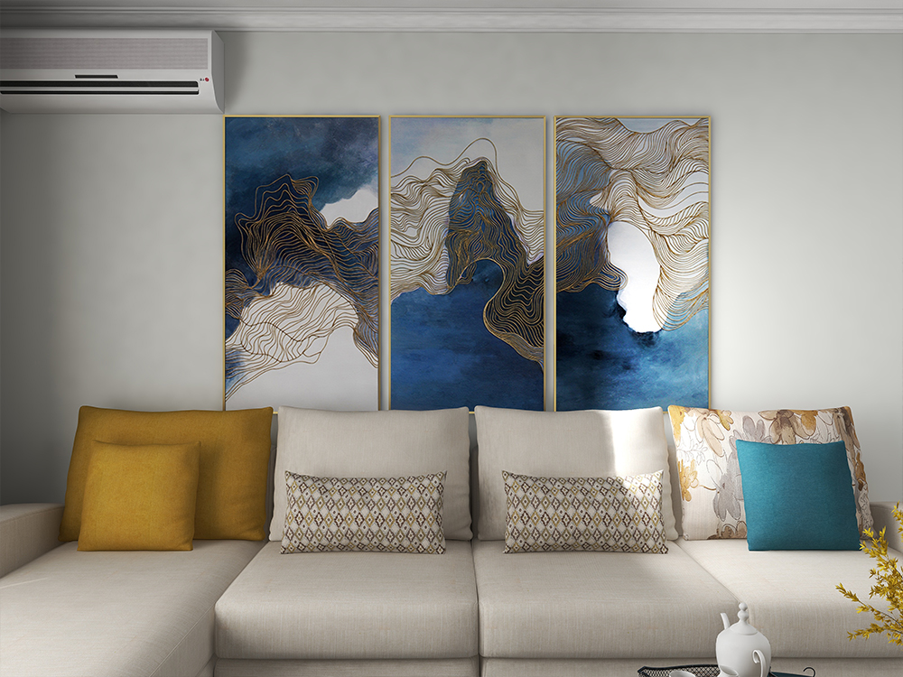 客厅淡灰色软包沙发点缀彩色靠枕,蓝色系挂画带来一份静谧端庄。