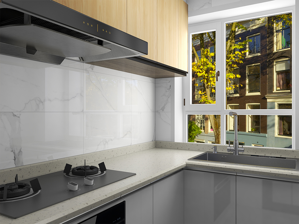 厨房灰色大理石岩板,搭配白色橱柜,在满是烟火气的房间里装扮出时尚空间感。