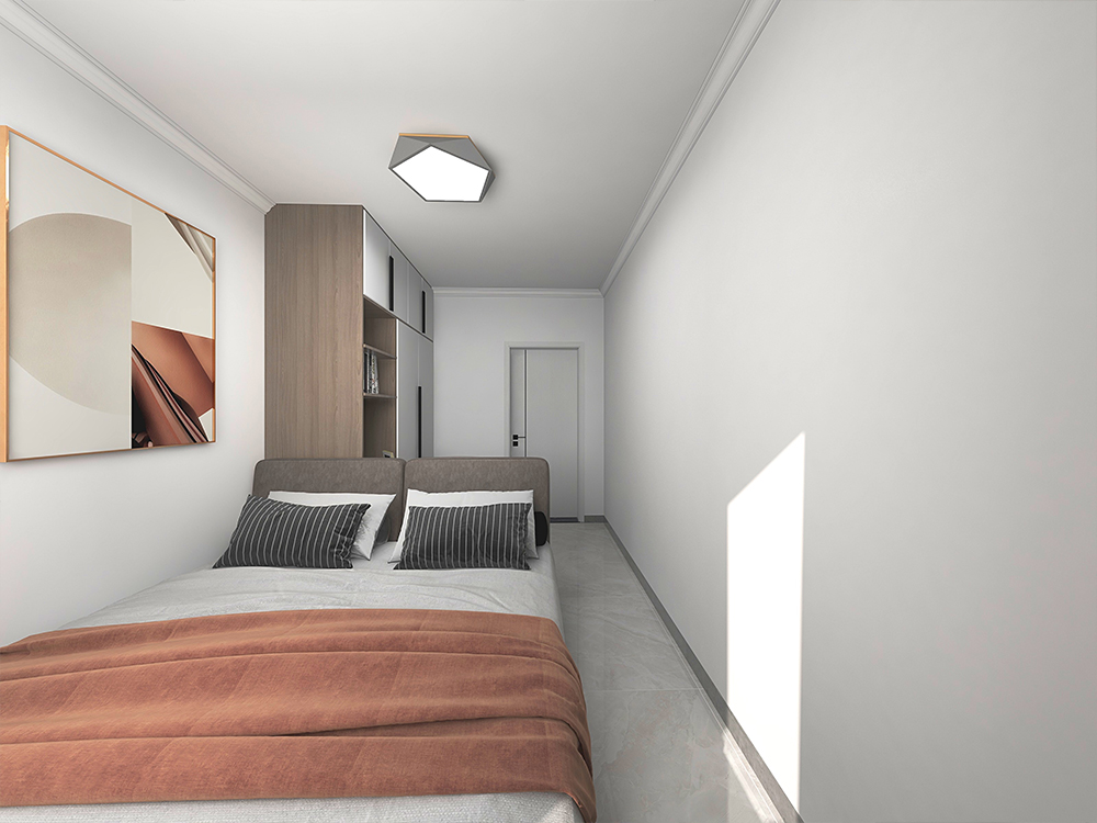 卧室的天花板四周装上石膏线,整体灰色调,咖色点缀,端庄而又雅致。