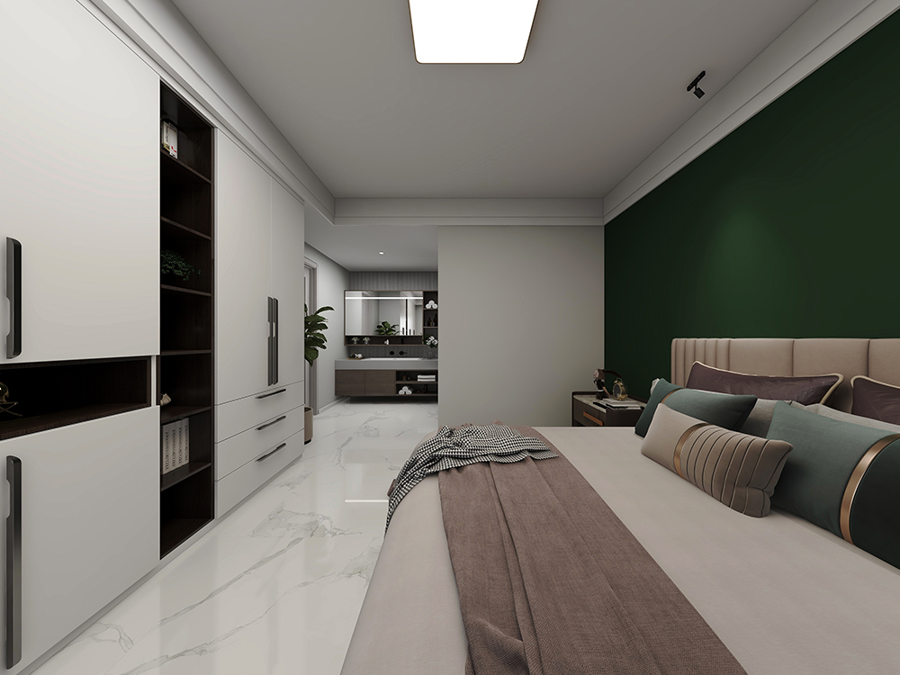 主卧采用墨绿色背景墙,氛围更加沉静,营造一个宁静安睡空间。