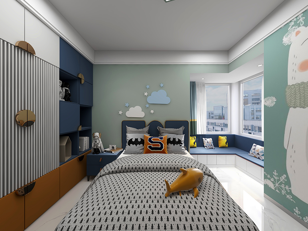 薄荷绿为主色,打造活泼清和,小面积白与蓝撞色,打造充足收纳空间。