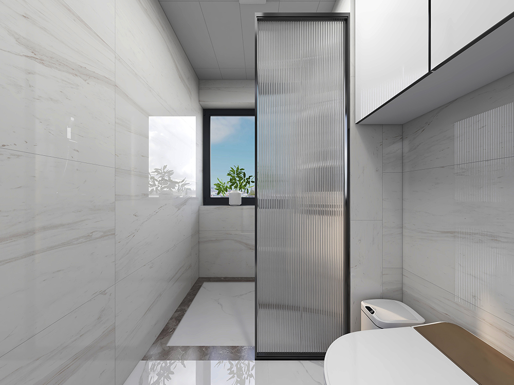 卫生间冷色调,使空间视觉干净整洁,长虹玻璃隔开淋浴区,减少排水隐患,易于打扫。